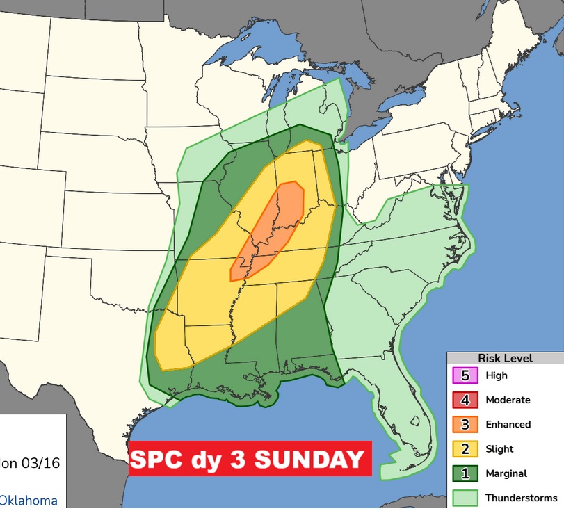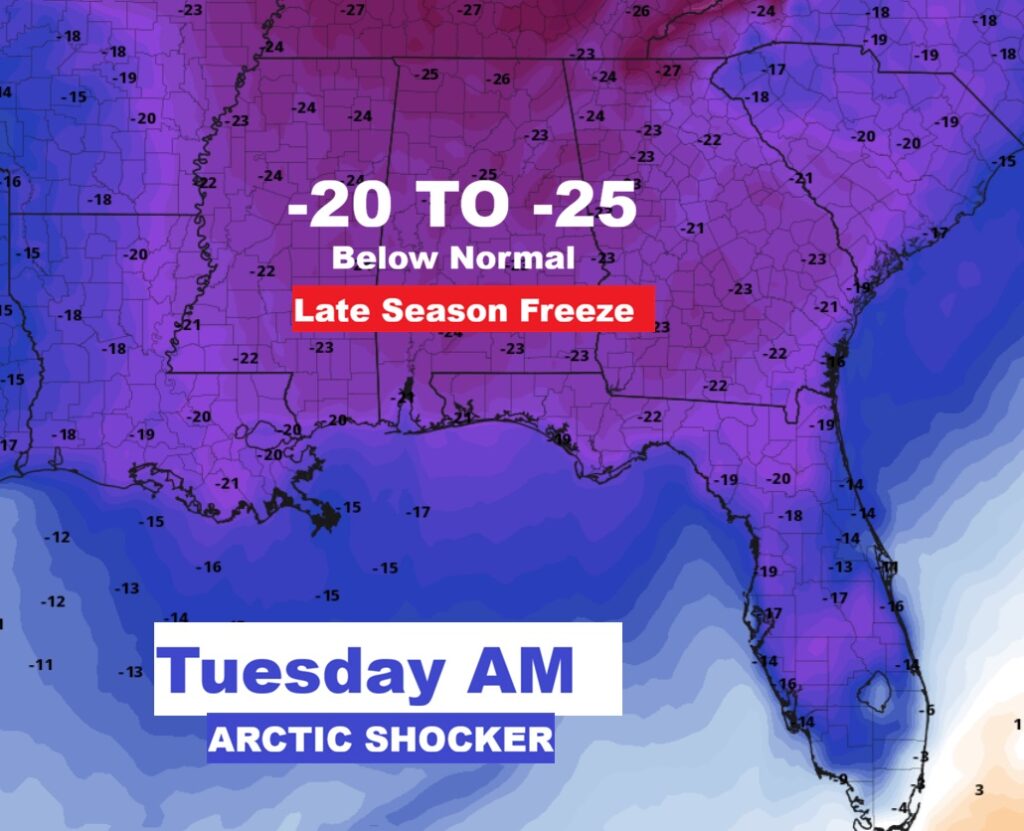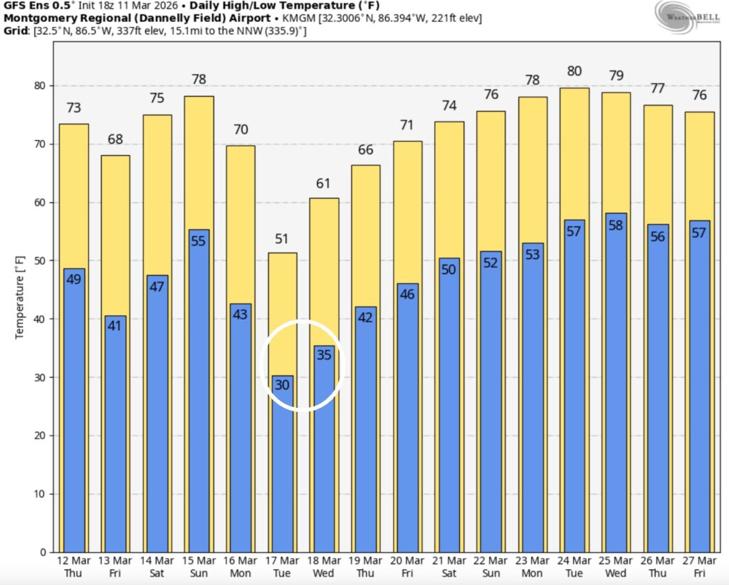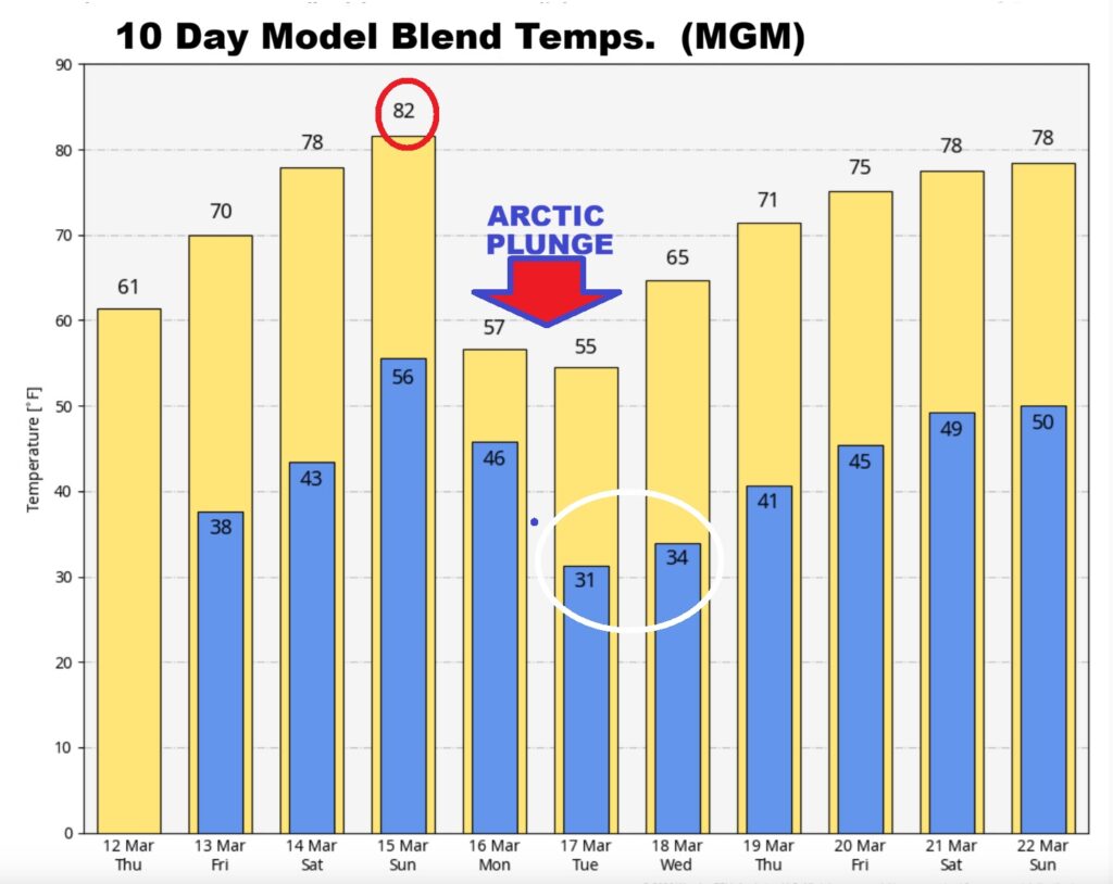 Good Morning! The 80+ degree heat continues for one more day before the bottom drops out. Yesterday Montgomery (MGM) tied another record with 86. Second day in a row. We’ll be near 85 again today. Alabama’s next Severe event is looming for Wednesday evening and Wednesday night. The Severe threat covers all of Alabama. The northwest counties have a Level 2 threat. All modes of Severe Weather are possible including tornadoes. The new SPC Tornado Risk product includes the threat of EF-1 tornadoes overnight. Thursday will be at least 20-25 degrees colder. We could reach the upper 30’s Thursday Night. The Big Cool-down won’t last too long. We’ll rebound to the upper 70’s Saturday and lower 80’s Sunday. But, Expect another temperature plunge around Monday and Tuesday, St. Patrick’s Day. CHILLY. Rollercoaster temperatures next 10 days. Here’s my brief video forecast discussion.