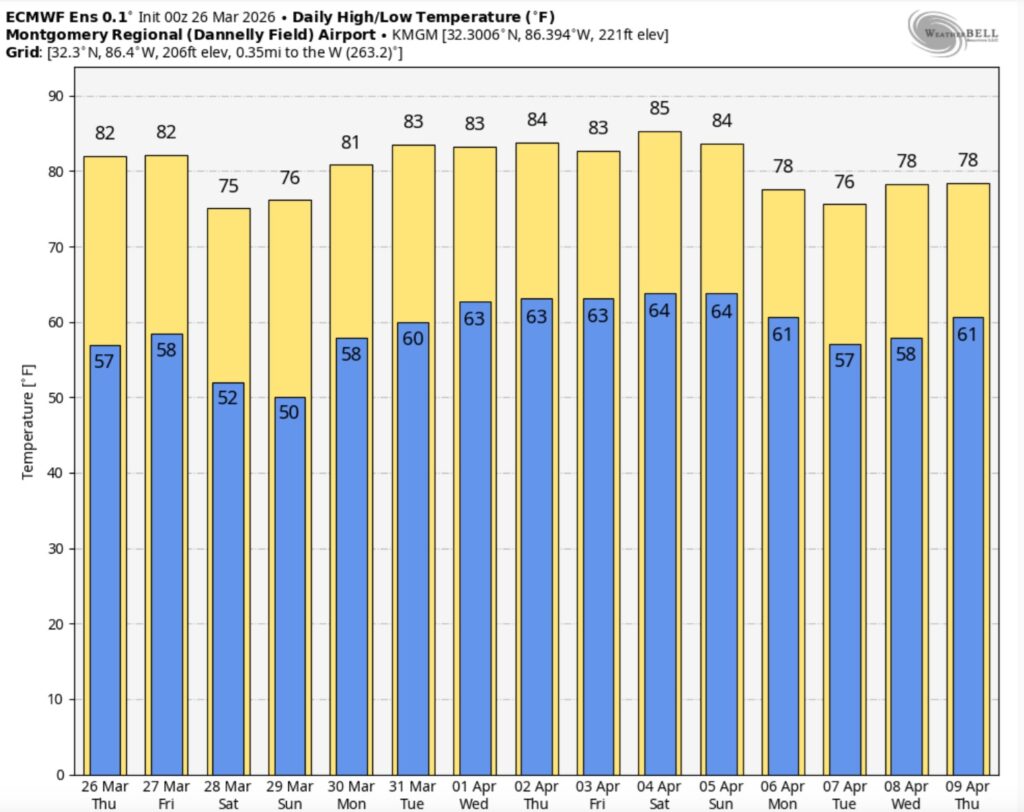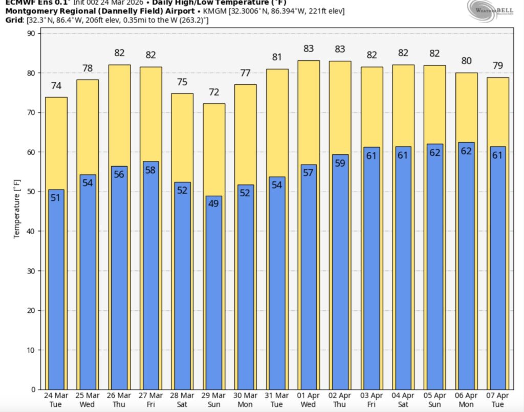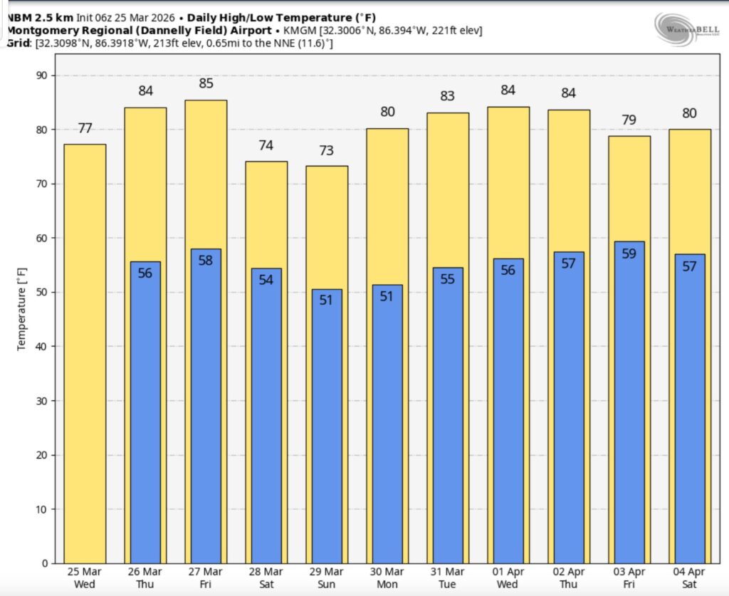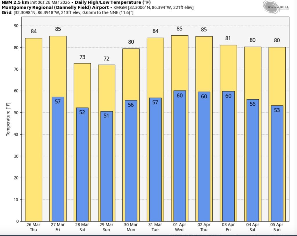 Good morning! Yesterday was cooler than Monday by about 10 degrees. The high in Montgomery was 76. Get ready for a very pleasant Wednesday. We’re the comfortable mid 70’s today. There will be another temperature rebound Thursday & Friday as highs recover into the low to mid 80’s.