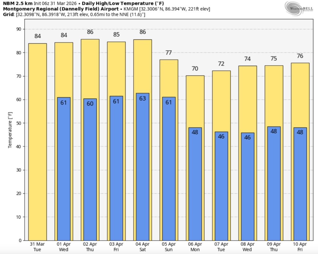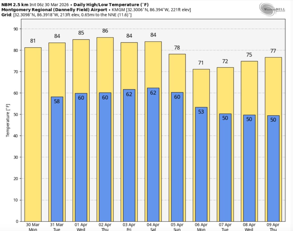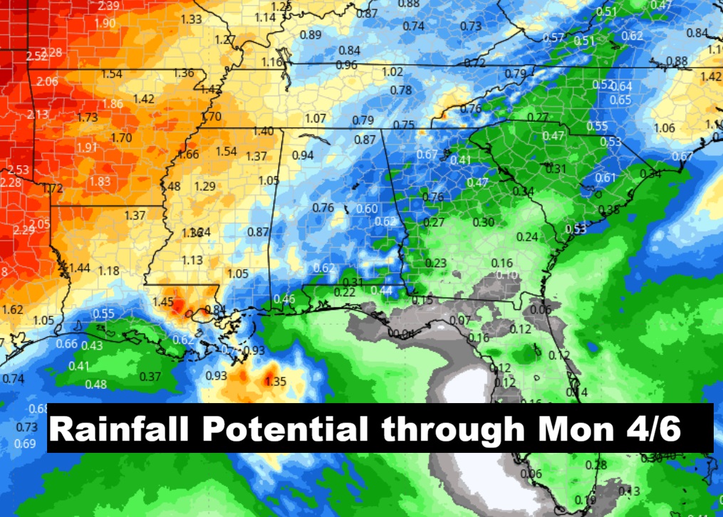 Good morning! After that big weekend cool-down – things will start to turn around today. A big warm-up begins. We’ll be 80+ today, and into the middle 80’s by Tuesday and Wednesday, as March comes to an end and April begin. As the upper high pressure ridge starts to break down and head east, spotty scattered showers and perhaps a few thunderstorms will start to pop up. So far, it appears the best rain chance will along and ahead of a weekend frontal system. Here’s my brief forecast discussion.