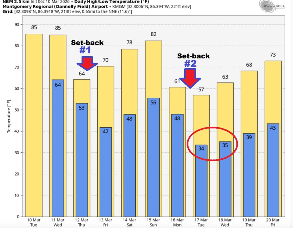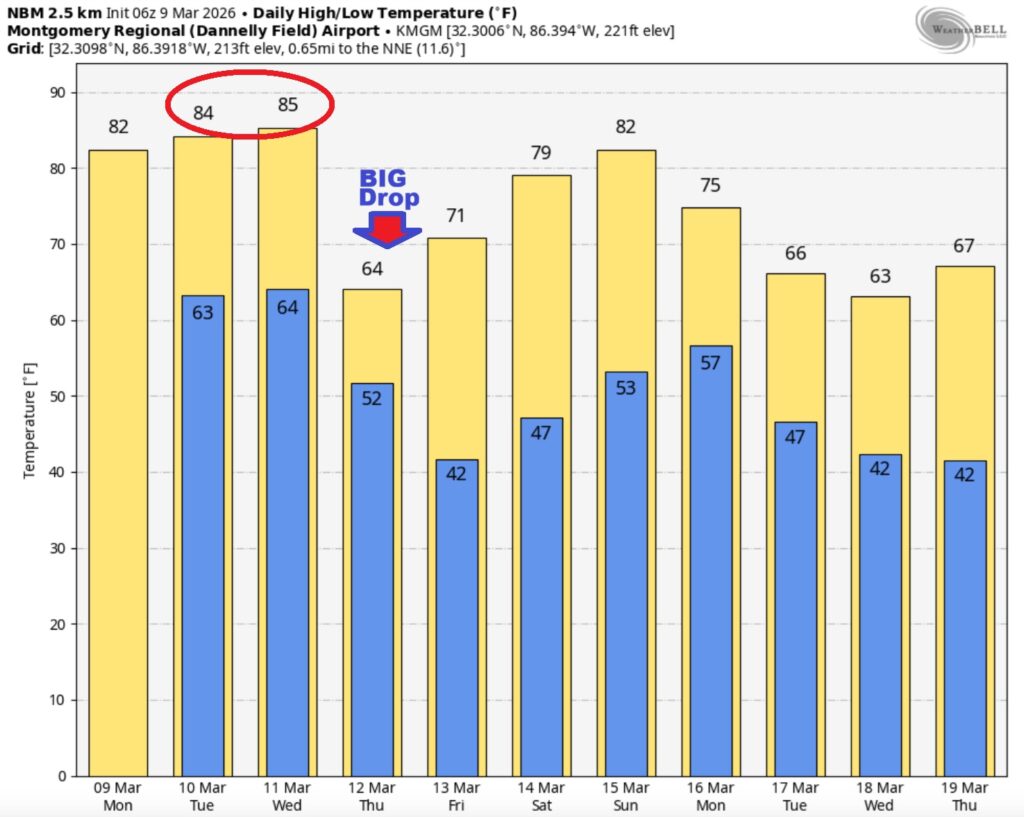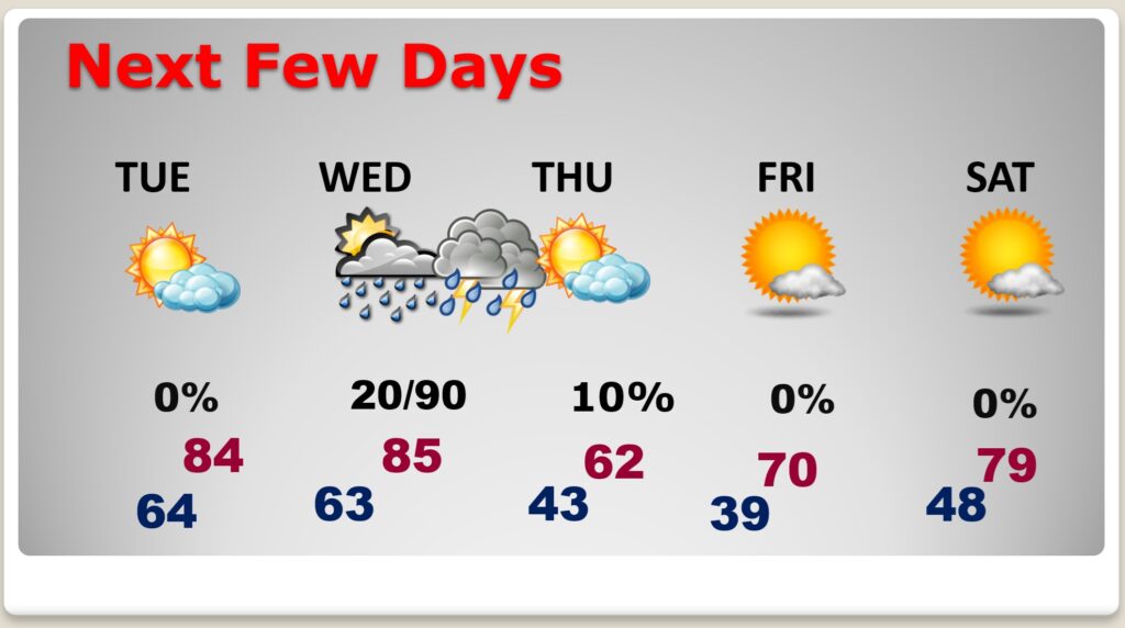 NEXT FEW DAYS: Expect mid 80’s Tuesday and Wednesday. A mid-week Storm System could bring strong/severe storms by Wednesday afternoon and especially Wednesday night. Expect a significant temperature crash Thursday. We could fall into the upper 30’s Thursday night.