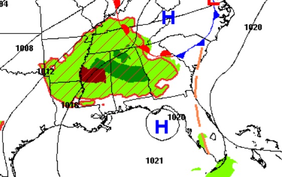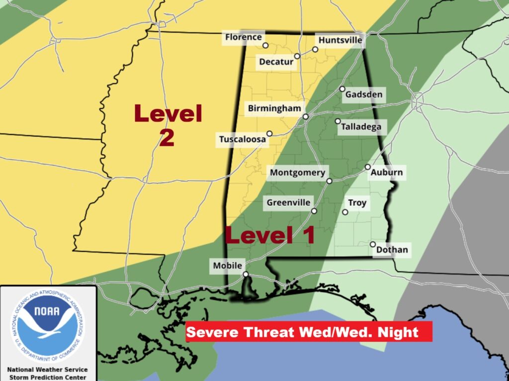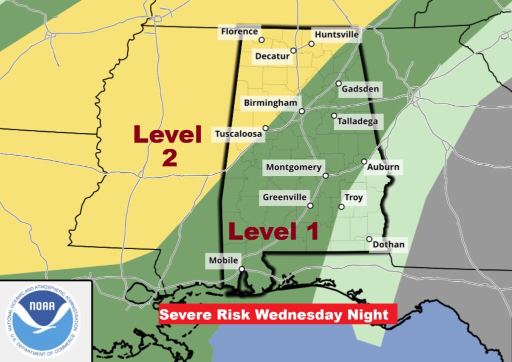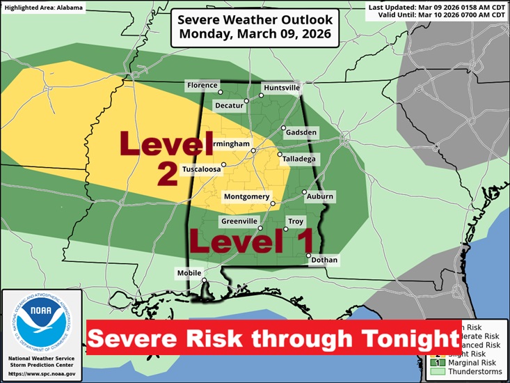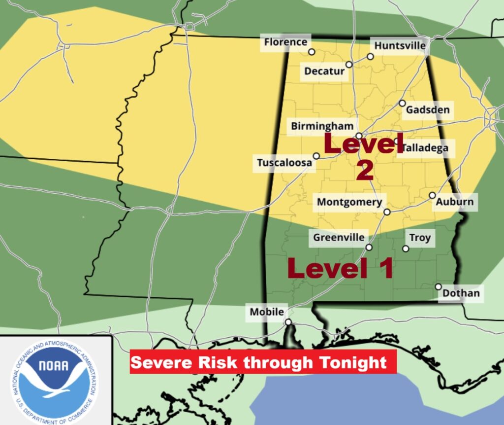 Level 1 – Marginal Severe Risk this afternoon and tonight. Damaging winds and Large Hail are the main risks. The Level 2 risk is now as far SE as a Talladega/Montgomery line.