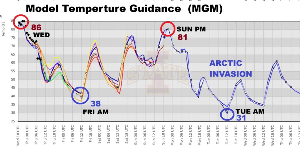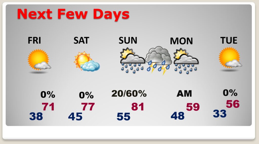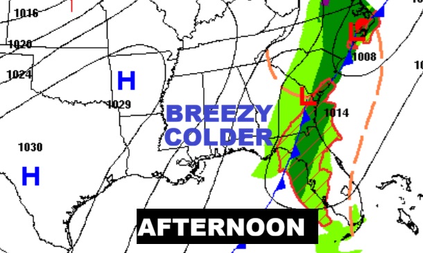 NEXT FEW DAYS: Thursday will be at least 20-25 degrees colder. We could reach the upper 30’s Thursday Night. The Big Cool-down won’t last too long. We’ll rebound to the upper 70’s Saturday and lower 80’s Sunday. But, Expect another temperature plunge around Monday and Tuesday, St. Patrick’s Day. CHILLY..