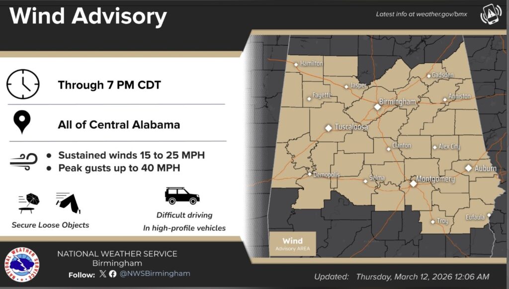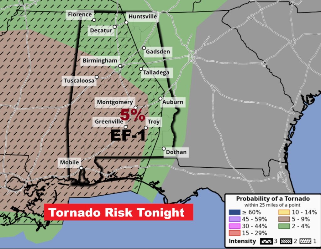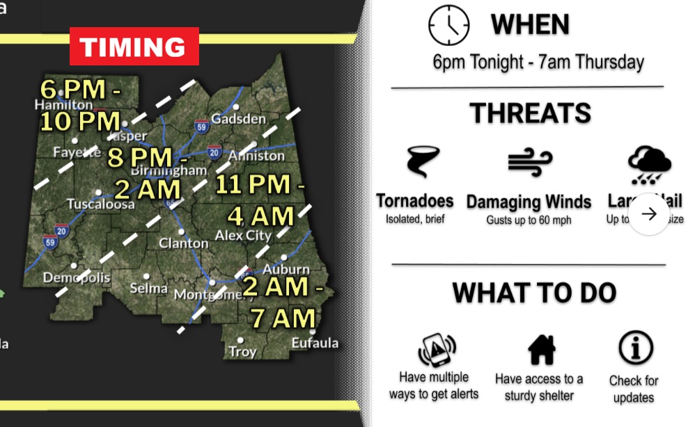 SPC Severe Risk through tonight has the Level 2 Severe Risk as far east as a Talladega/Troy line. All modes of severe weather: damaging winds, Large Hail, tornadoes.
