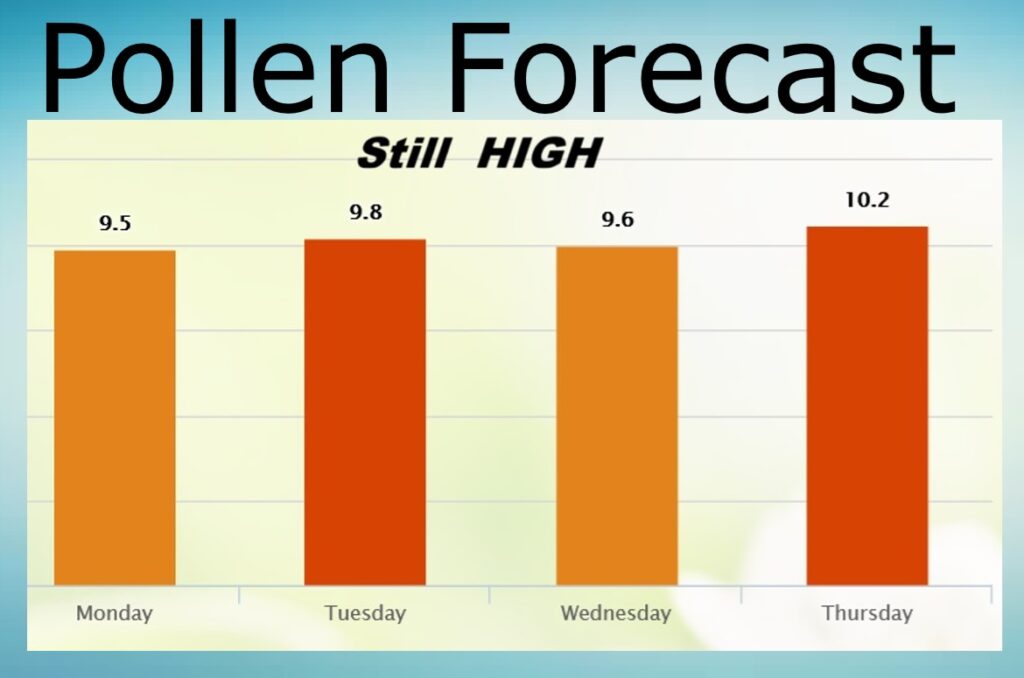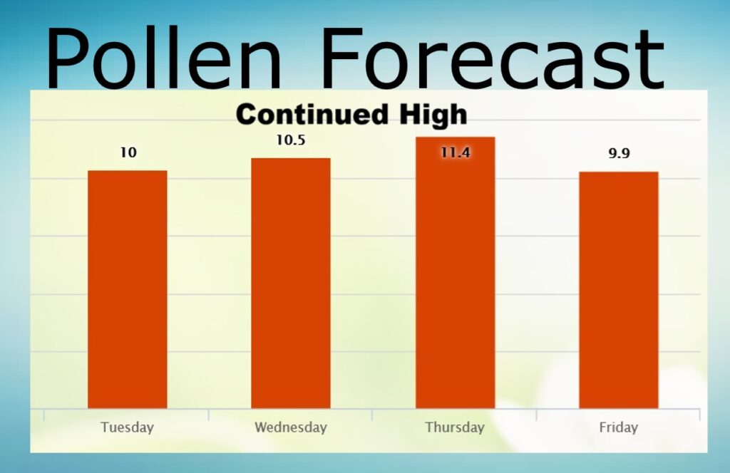 POLLEN FORECAST:. No end in sight. Still the pollen numbers are in the high range through the week ahead.
