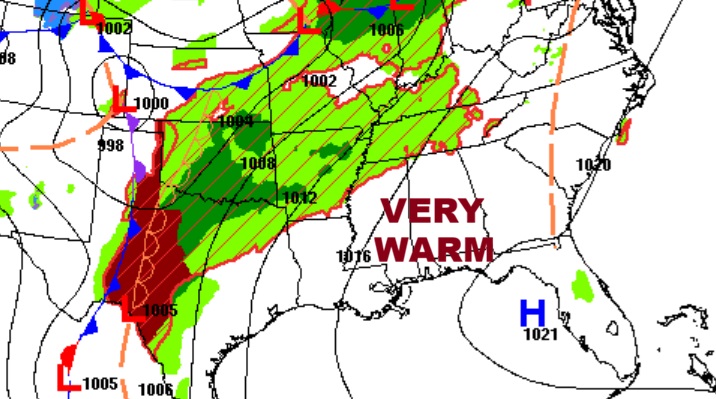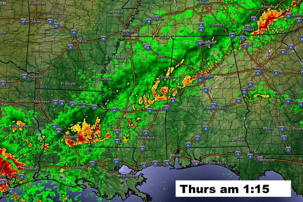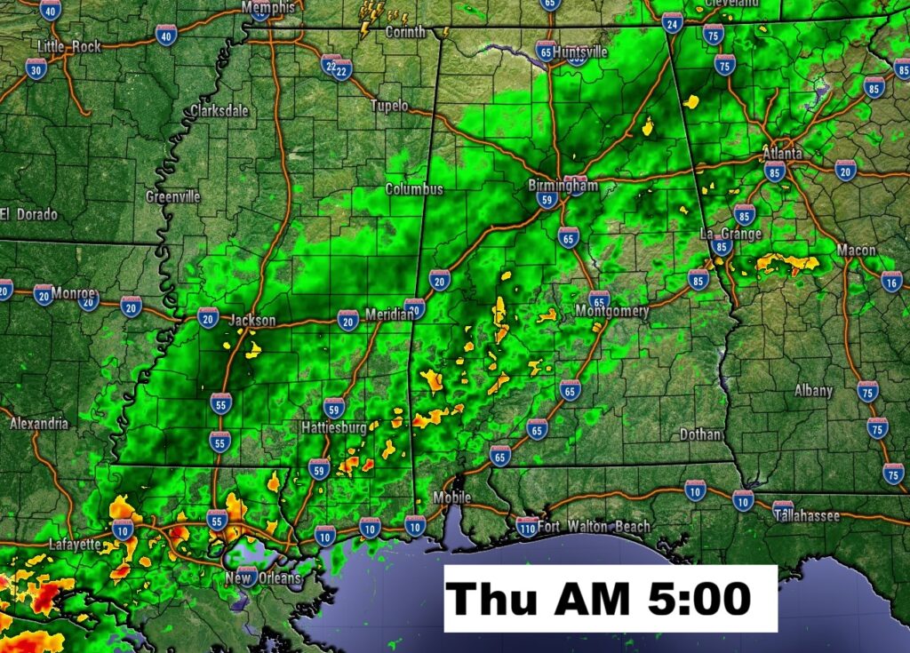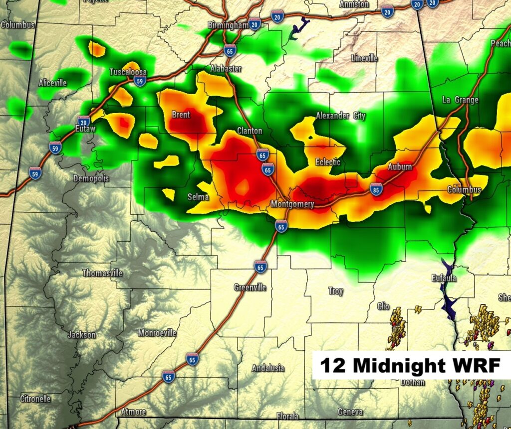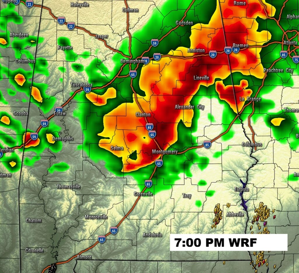 Tonight’s Severe Threat continues to expand and now cover ALL of Alabama. In fact the Level 2 threat now covers the northern 2/3 of the state as far as a Atlanta/Greenville line. While Damaging wind gusts and large hail remain the main threats – isolated tornadoes can’t be ruled out (increase threat to 5%).