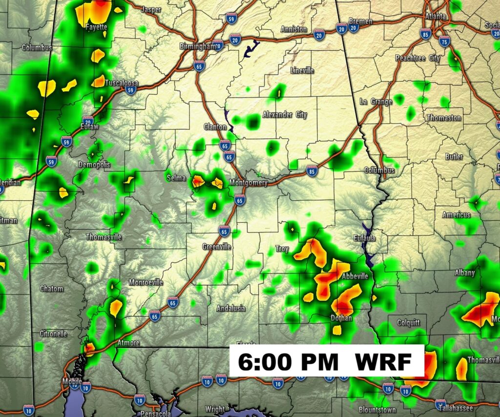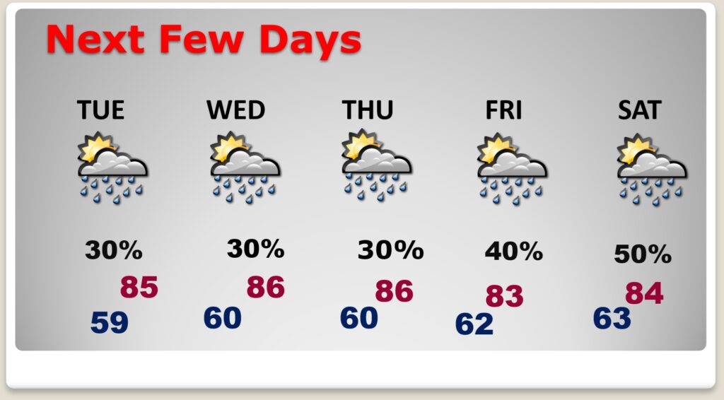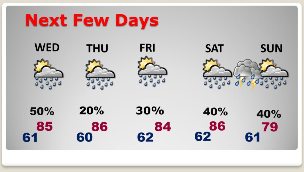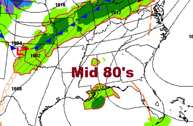 NEXT FEW DAYS: The warm-up continues. Highs will be in the 80’s each day. Lows will be mostly in the lower 60’s. Spotty, random, scattered showers and a few thunderstorms are possible each day. Many towns will get skipped. The best rain chance will along and ahead of a weekend frontal system.