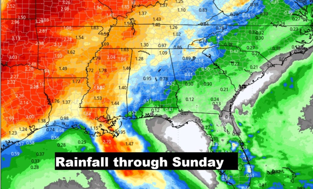 Here’s the rainfall outlook through the weekend. Notice the heavier totals across the northwest half of the state.