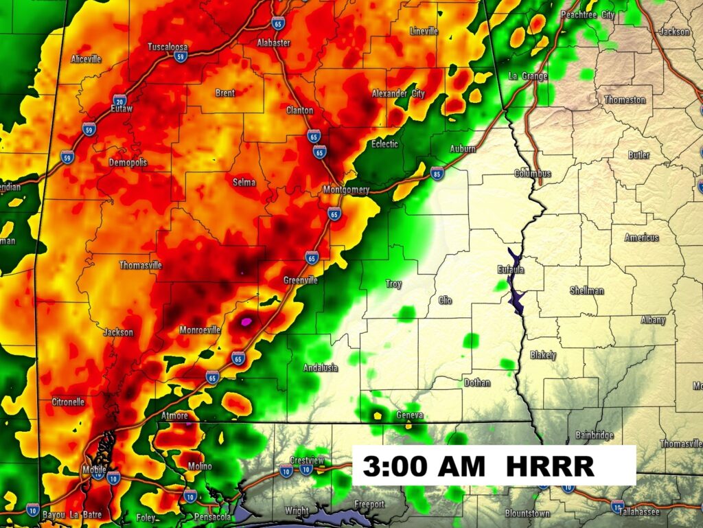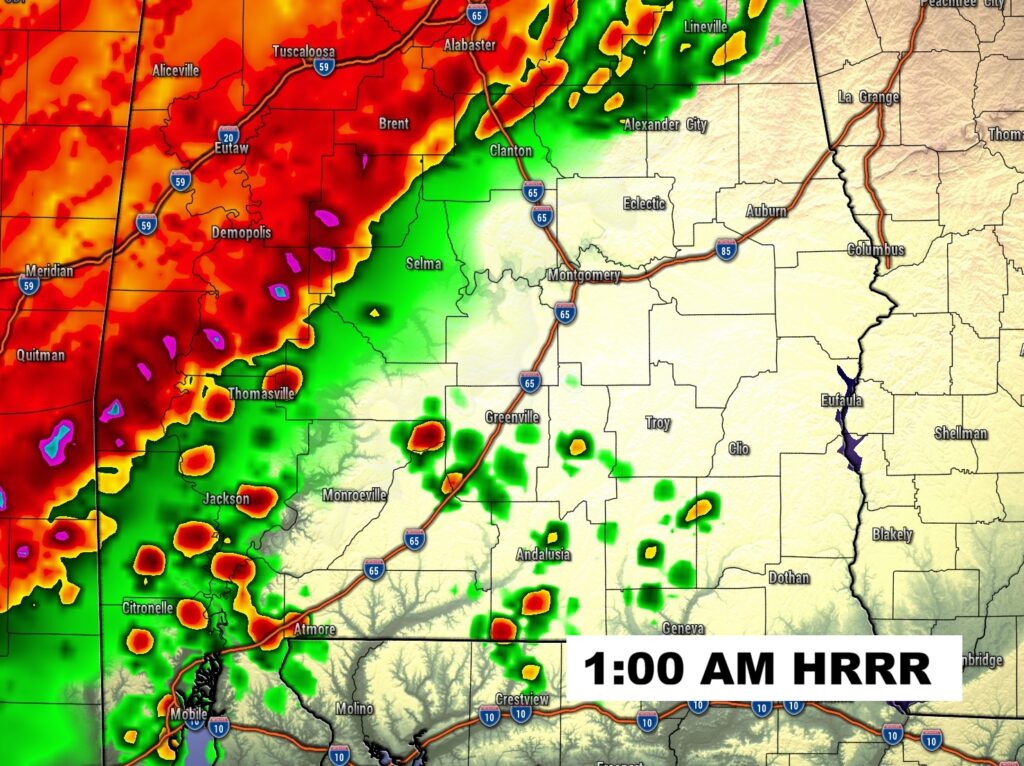 FUTURE RADAR speaks for itself. This is the HRRR model. Very stormy night ahead. Squall line marches eastward. (QLCS) Some storms Severe. Level 2 Severe risk as far east as a Talladega/Troy line. All modes of severe weather including tornadoes. Make sure our weather App has notifications turned on. Keep it next to you. Make sure the weather radio is plugged in and in the Alert mode. Do not trust hearing Tornado Sirens.
