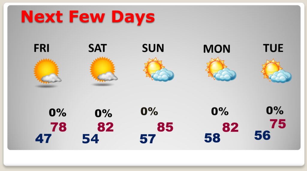 NEXT FEW DAYS: Temperatures are on the re-bound. Upper 70’s Friday. More sun. Lower 80’s Saturday. Still storm-free and dry. Middle 80’s Sunday. Still warm and dry Monday.