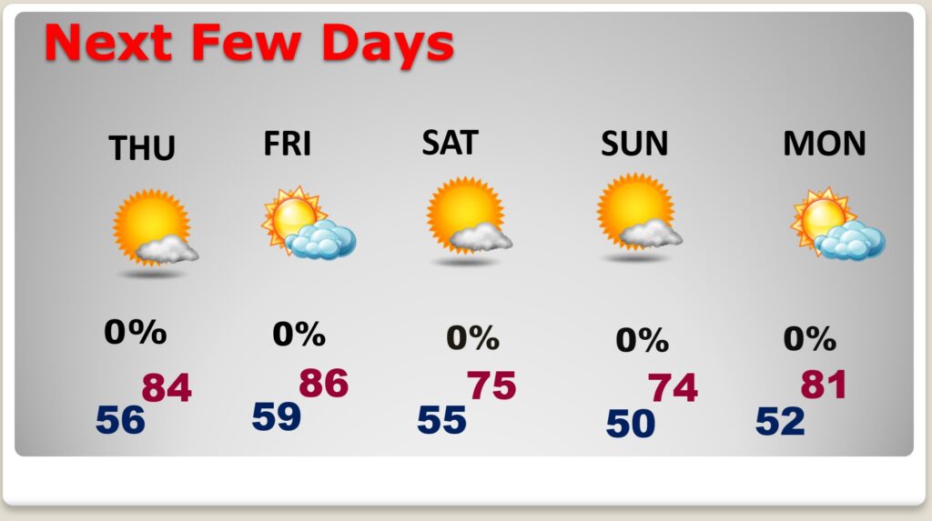 NEXT FEW DAYS: The forecast is very quiet. Uneventful. There will be another temperature rebound Thursday & Friday as highs recover into the low to mid 80’s.