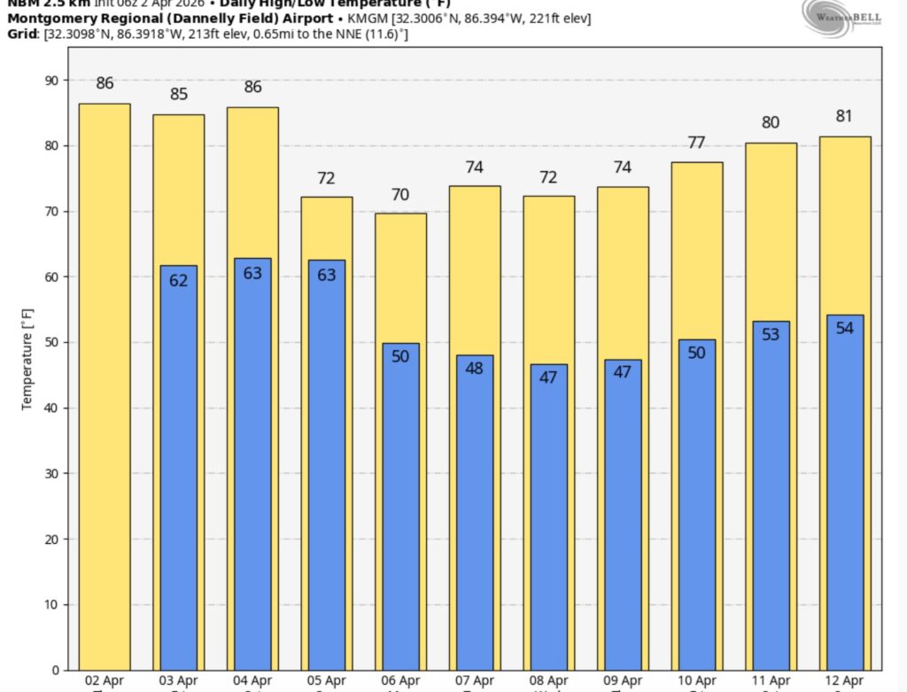 The 10 Day model Blend Temperature Trend. Mid 80’s each day through Saturday. Then much cooler behind the Easter weekend front. Lows fall back to the 40’s starting Sunday night. (Normal hi/lo 76/49)