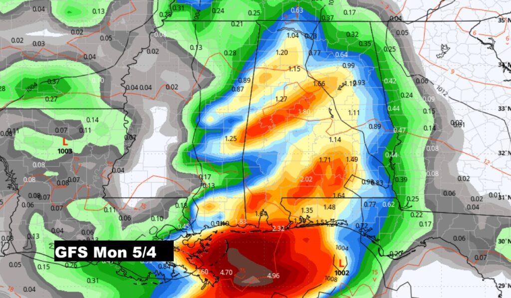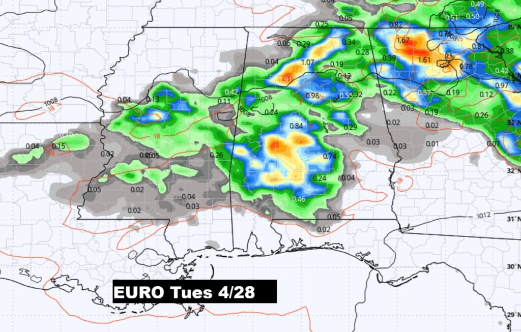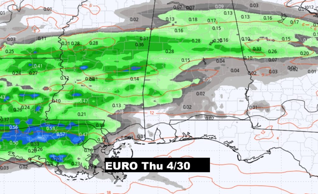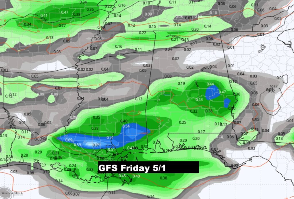 WEEKEND STORM SYTEM/FRONT: Showers and thunderstorms. I would say the best chance would be Saturday afternoon into Sunday. Will there be a severe weather component in the Saturday PM/Sunday storm system. Still too early to say. By the way, there will be a series of storm systems April 25 – May 3rd. An active period of time.