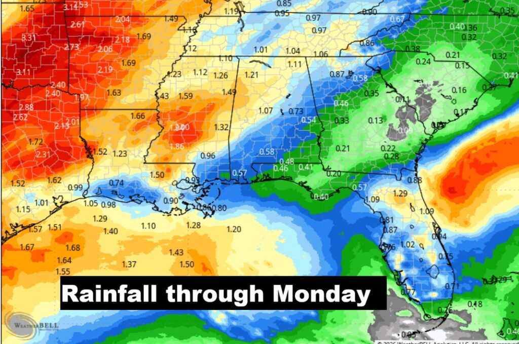 Here’s the rainfall outlook through Monday. Notice the heaviest projected rainfall will be across the northwest half of the state.