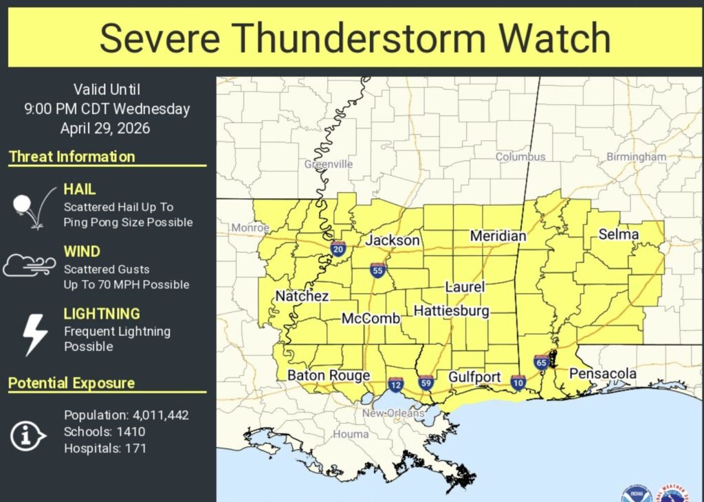 A severe thunderstorm watch now covers much of west and part of south Alabama until 11PM. The watch extends as far east as Lowndes, Crenshaw and Butler counties. Threats: Damaging winds to 70 mph. Ping pong size hail. A couple of tornadoes are possible. You need more than one reliable methods of receiving severe weather watches and warnings. Our free weather app will send you instant push notifications for severe weather alerts. In the App store – search Rich Thomas Weather. Make sure your Weather Radio is in the alert mode. Stay weather aware.