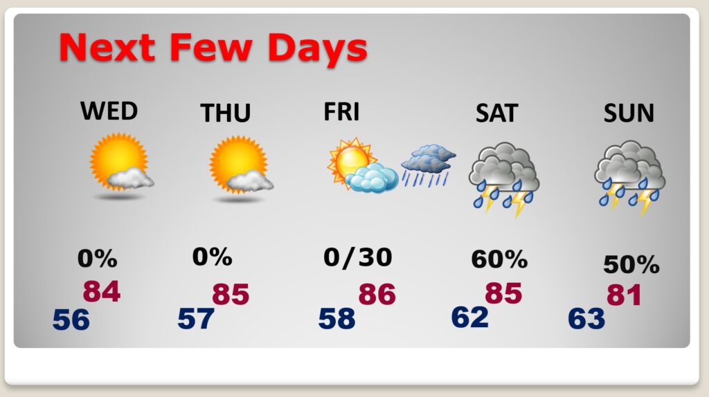 NEXT FEW DAYS: Tuesday will be another chilly jacket weather morning for so late in the season. We’re in for quite a rebound in the week ahead. Expect middle 80’s again by middle of the week. We are dry and storm-free at least through Thursday Risk of scattered showers Friday. Stormy at times over the upcoming weekend.