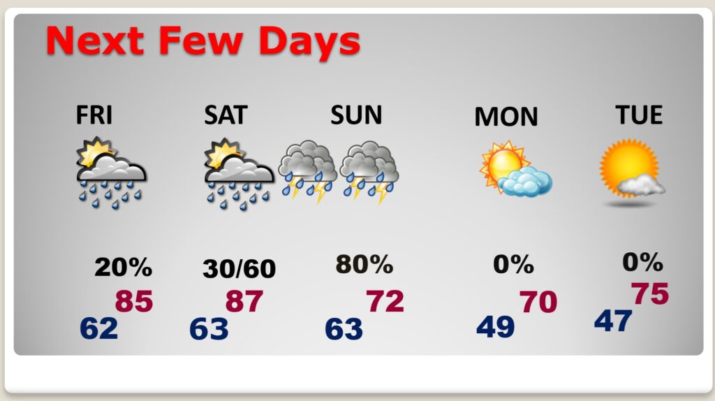 NEXT FEW DAYS: It feels more like May for now. Highs will be in the 80’s each day through Saturday. Lows will be mostly in the lower 60’s. Spotty, random, scattered showers and a few thunderstorms will pop up mostly in the afternoon and evening hours again Friday. The best rain chance will along and ahead of a weekend frontal system, especially late Saturday night and Easter Sunday morning. Then it will turn much cooler behind the Easter weekend front. Lows fall back to the 40’s for several nights starting Sunday night. Monday’s high will barely reach 70.