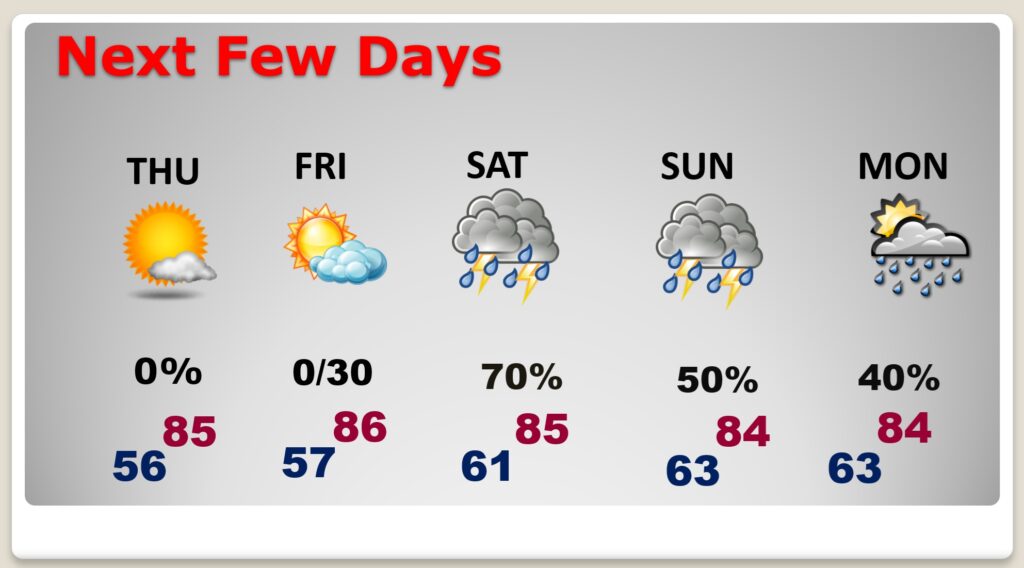 Expect middle 80’s Wednesday through the weekend. It’s dry forecast through Friday evening. A weekend storm system will bring scattered showers and thunderstorms Saturday and Sunday. That could be the start of a very active 10 day stretch of days with multiple disturbances. A significant pattern change. Here’s my brief video forecast discussion.