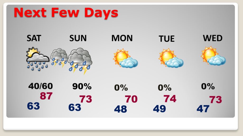 Good morning! Our taste of May in early April continues for now. Wednesday’s high was 86, and mid 80’s are likely again today through Saturday, before another big cool-down. Spotty, random, scattered showers and a few thunderstorms will pop up mostly in the afternoon and evening hours again today through Saturday. The best chance of showers and storms will be late Saturday night and Easter Sunday morning along and ahead of a cool front. Sunday and Monday will be several degrees cooler. Lows fall back to the 40’s for several nights starting Sunday night. Here’s my brief video forecast discussion.