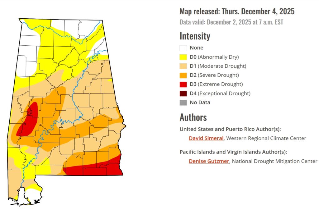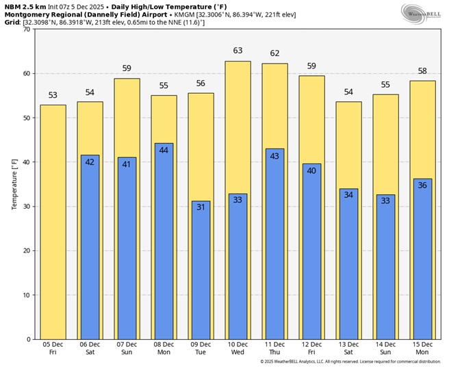 Good Morning! A very chilly December pattern continues, and it will continue wet at times. Not a pleasant pattern, and unfortunately, it has already had an impact on scheduled holiday events in the area. It won’t rain all the time. There will be several dry hours. But, there will continue to be periods of light rain at times through Saturday and possibly even early Sunday. By far, the highest rainfall totals will be south of the I-85 corridor. Southeast Alabama will see the heaviest totals. Meanwhile, temperatures will continued cold most of the time for the next few days. Here’s my brief forecast discussion.