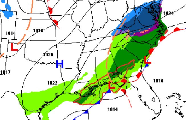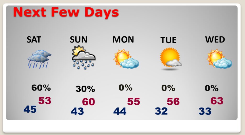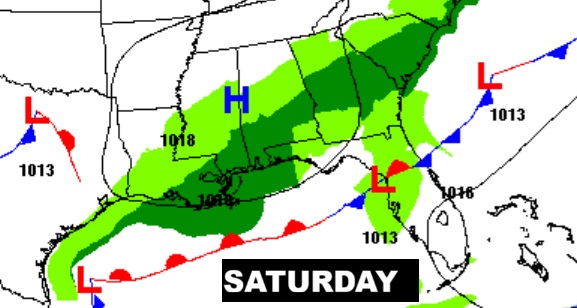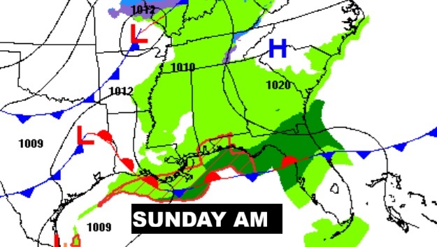 NEXT FEW DAYS: There will be periods of a cold rain today through Saturday – as a series of Lows slide eastward across the Gulf coast. Leftover showers may linger into Sunday AM, too. It won’t rain all the time. There will be several dry hours. But, there will continue to be periods of light rain at times. Temperatures may hover near 50 today, after a dismal high of 45 yesterday. We may tease 60 by Sunday afternoon.