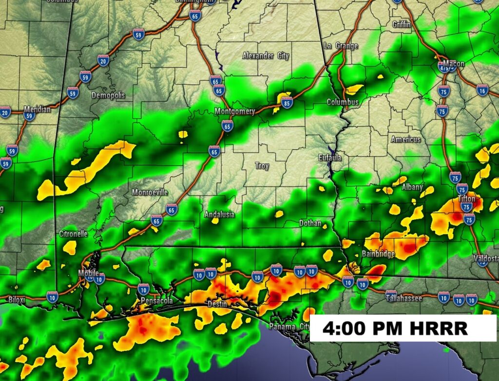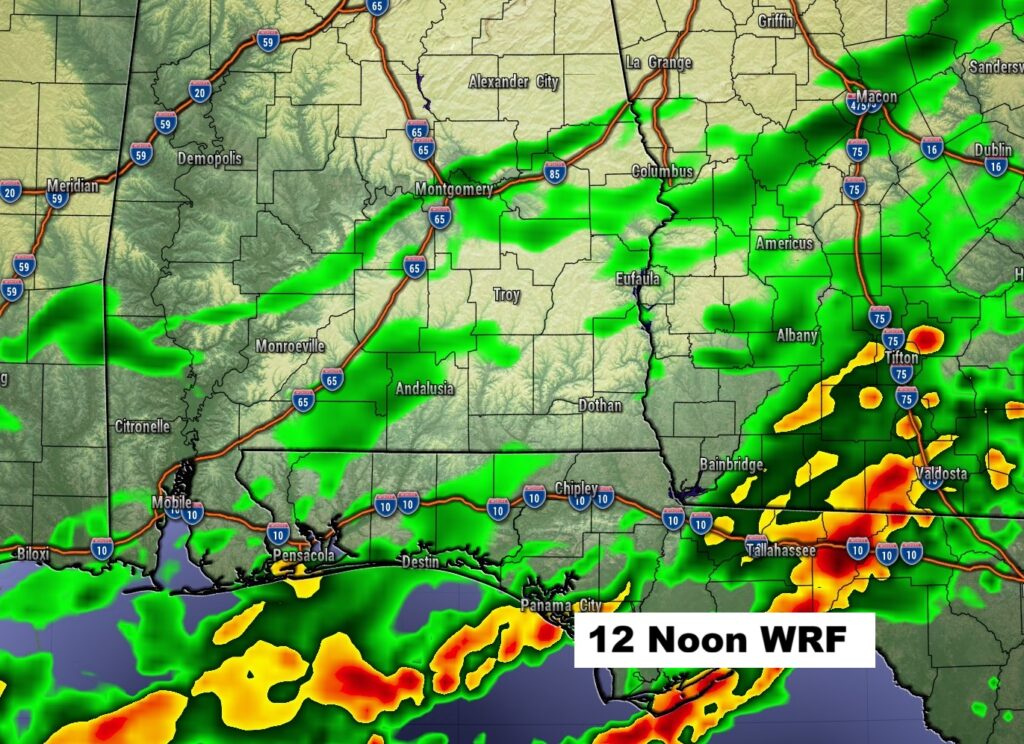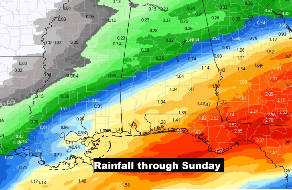 Here’s the anticipated rainfall through Sunday. By far, the highest rainfall totals will be south of the I-85 corridor. Southeast Alabama will see the heaviest totals.