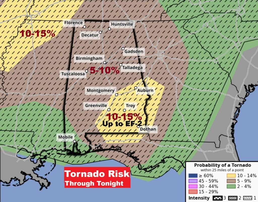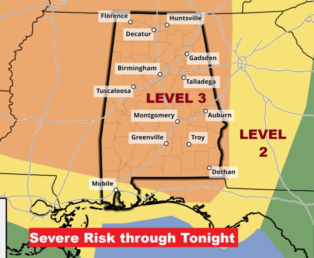 Most concerning is a Level 3 – Enhanced Severe Risk covering the southeastern third of the state, along and SE of a Auburn / Montgomery / Greenville line. In this zone, there is a risk of cellular supercells. Storms by themselves. Strong tornadoes (EF-2+) are not out of the question. Damaging wind gusts to 70+ mph are also possible. Large hail is less of a threat, but possible.