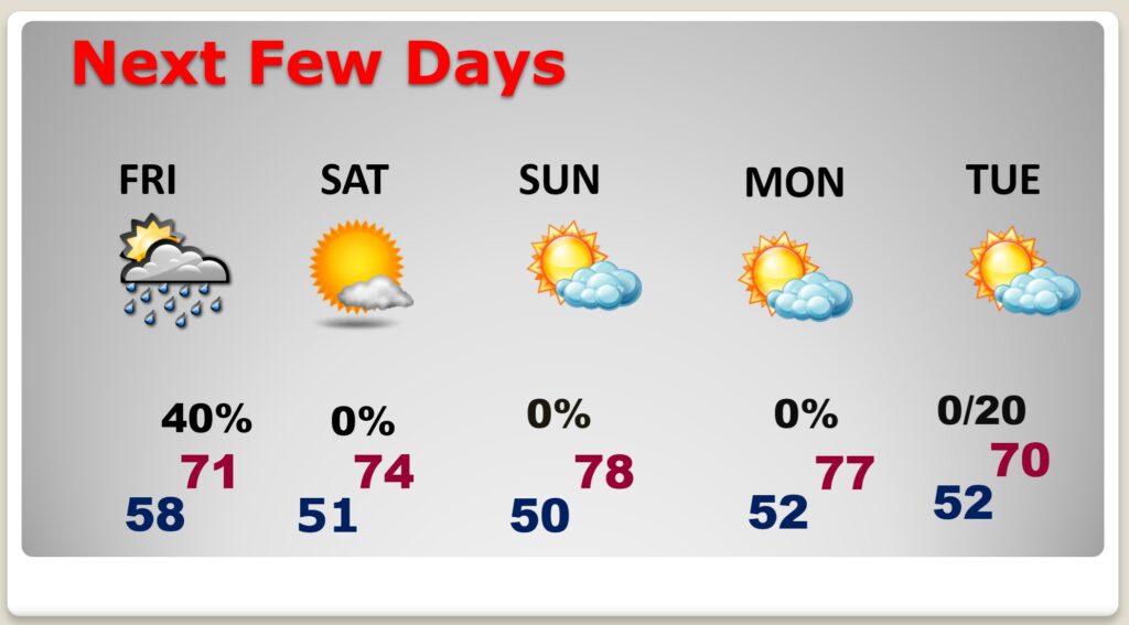 NEXT FEW DAYS: Risk of showers ends lunchtime Friday. Afternoon improvement. But, this time – no big temperature drop is expected. In fact, we have a rather spectacular weekend forecast. Expect plenty of sunshine. Highs in the 70’s. 50’s at night. Next small rain chance Tuesday night as a disturbance brushes by the area. Looks to be like the next big deal storm system will be sometime during the week of March 8-13th. Timing varies.
