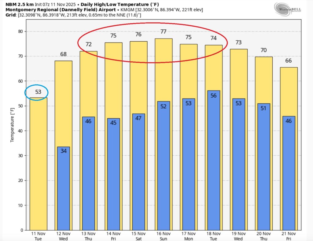 Good Morning! It’s not only extremely cold – now it’s Record Breaking Cold. An Arctic Shocker. We’ll be in the Lower 20’s by Dawn. The Montgomery record of 29 (1926/1991) fell at Midnight. Monday’s high was only 47 with winds gusting to 36. On this Veteran’s Day our high may barely reach 53. We’re headed for the low 30’s again tonight, perhaps flirting with the second Freeze of the season. Expect a BIG Warm up ahead. Upper 60’s Wednesday. Back to the 70’s Thursday through the weekend. Next chance of rain Sunday and Monday. Here’s my brief video forecast discussion.