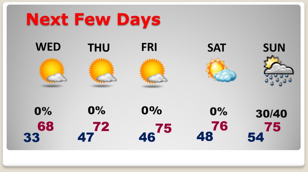 NEXT FEW DAYS: Expect a BIG Warm up ahead. Upper 60’s Wednesday. Back to the 70’s Thursday through the weekend. Next chance of rain Sunday and Monday.