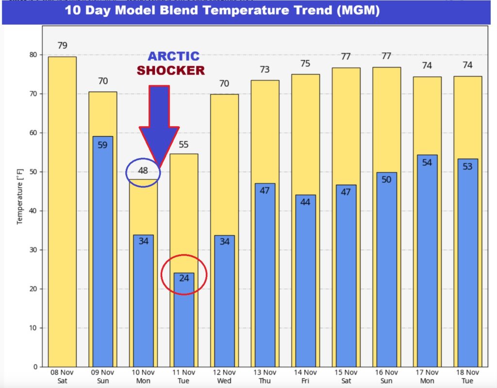 Good Morning!    Our nice warm pattern continues for one more day.  High today will be in the upper 70’s. An approaching frontal system will bring scattered showers and storms to the state late tonight after Midnight.  Sunday will be breezy and much cooler with a high in the upper 60’s Sunday.   But hang on. Get ready for an early season Arctic Shocker. A surge of Arctic Air will engulf our state and much of the central and eastern US.  It will become progressively colder. Sunday night. It will be windy and cold.  There will be a significant temperature crash. Monday’s high will only reach the 40’s, but wind chill will be a factor.  The coldest morning will be Tuesday with the first widespread freeze and lows in the middle 20’s. There will most certainly a freeze warning.  This will end the growing season officially.  Temperatures will moderate late next week.