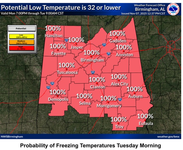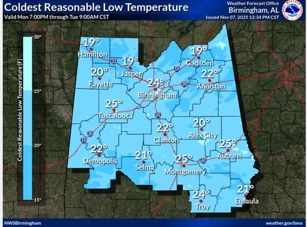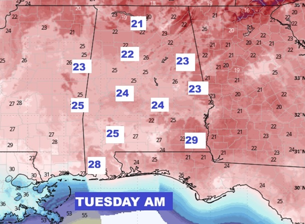 The COLDEST morning will be Tuesday morning.  Look at the numbers!