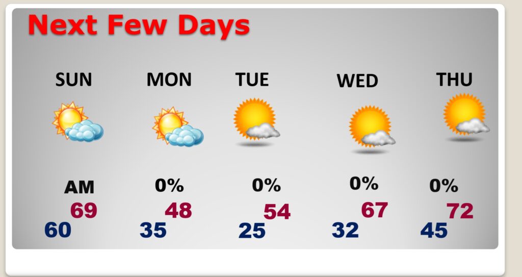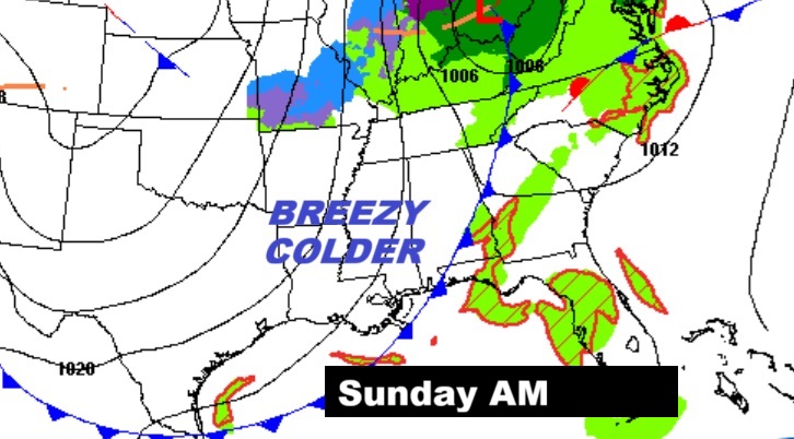 NEXT FEW DAYS:    Harsh early taste of WINTER is on the way.  It will become progressively colder. Sunday night. It will be windy and cold.  There will be a significant temperature crash. Monday’s high will only reach the 40’s, but wind chill will be a factor.  The coldest morning will be Tuesday with the first widespread freeze and lows in the middle 20’s. There will most certainly a freeze warning.  This will end the growing season officially.  Temperatures will moderate late next week.