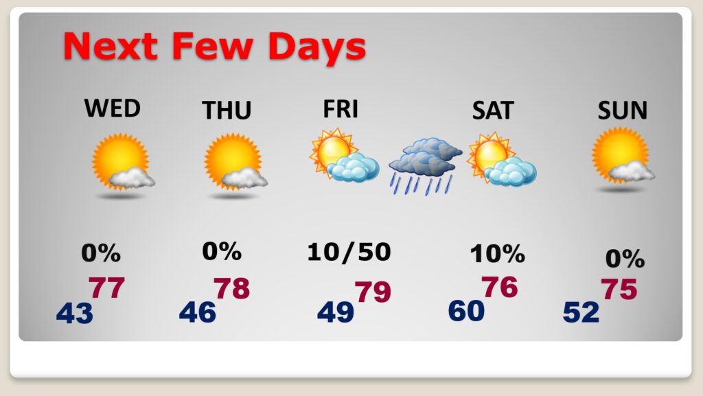 NEXT FEW DAYS: A big warming trend continues. We should reach the upper 70’s Thursday through Saturday. Nights continue to be quite cool. But, even the nights will slowly start to moderate. An approaching frontal system will bring showers and storms to the state Friday and especially Friday night. Some storms could reach Severe Limits. Cooler and then COLDER will follow. But not right away. Highs in the 70’s are still a good bet even Sunday. Expect a surge of Arctic Air will arrive by Monday. There will be a significant temperature crash. Looks like the coldest morning will probably be Tuesday with the first widespread freeze and lows in the 20’s.