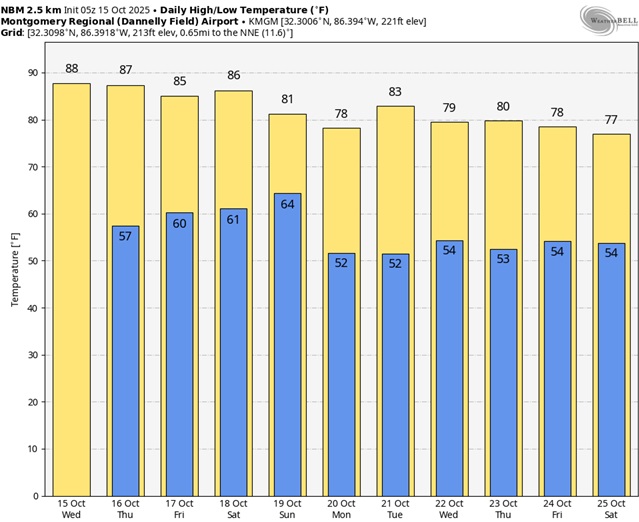 Here’s the 10 day Model Blend temperature trend.  Temperatures will cool down again next week behind Sunday’s Cold front. (Normal 81/55)