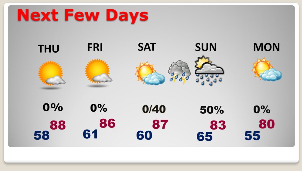 NEXT FEW DAYS:  Temperatures continue to rebound.  Days are warmer.  Nights are not as cool. It’s still a bone-dry forecast through at least Saturday.  Scattered showers return to the forecast Saturday night and especially Sunday.