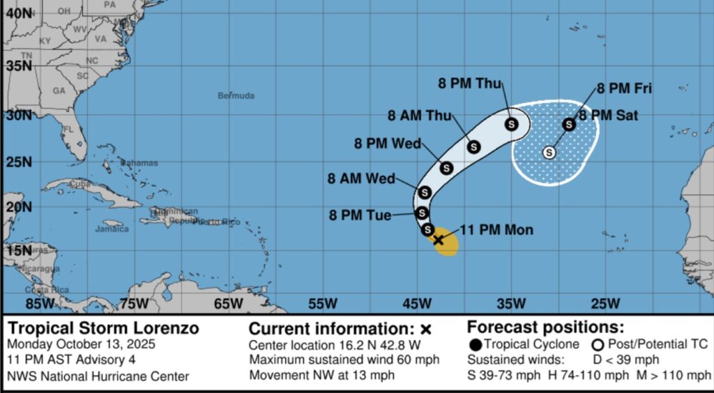 Tropical Storm Lorenzo is growing stronger is the far east Tropical Atlantic, curving eastward. It is not expected to become a hurricane. The rest of the Atlantic Basin is quiet for now.