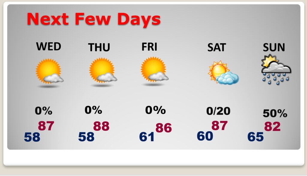 It’s still a bone dry forecast at least through Saturday. Scattered showers return to the forecast late Saturday night and especially Sunday. Next week looks dry again, with another cool-down expected. Here’s my brief video forecast discussion.