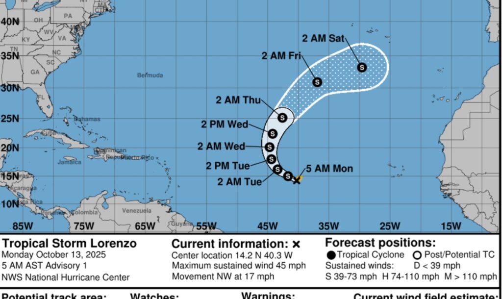 The 12th name of the Tropical Season — Lorenzo was named this morning in the far eastern Tropical Atlantic with 45 mph winds. It will take a big right hand curve in the east Atlantic.
