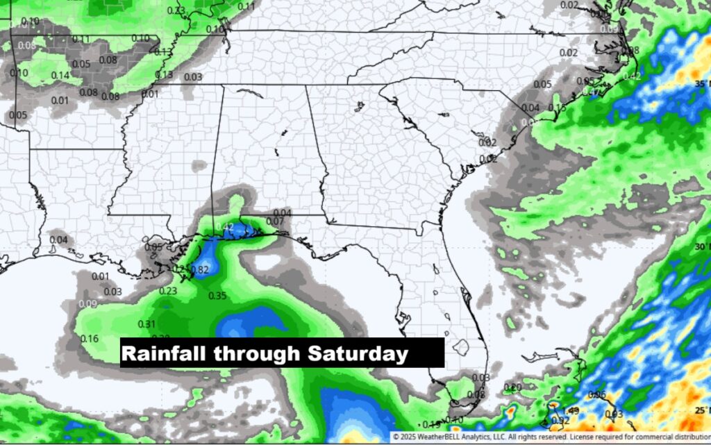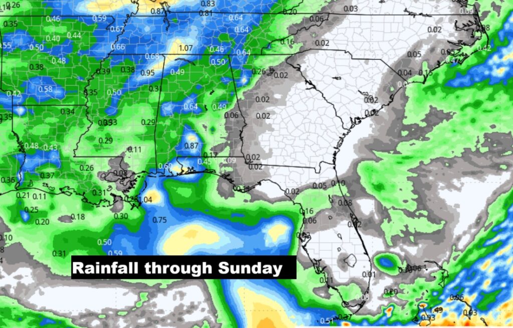 NO rain is expected through Friday. . Scattered showers return to the forecast Saturday night and Sunday ahead of the next front.