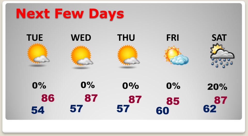TODAY: Sunshine. Low humidity. High 85. North wind 5 to 10 mph. Clear and cool tonight. Low 57.
