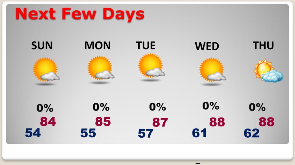 TODAY: Sunshine. Low humidity. Nice Breeze. High in the lower 80’s. North wind 6 to 12 mph. Clear and cool tonight. Low 54.