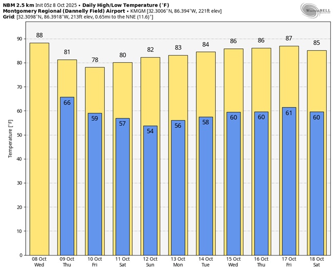 Good Morning! Random isolated widely scattered showers are possible again today, but not many. The Drought continues to worsen. Expect upper 80’s again today. A cold front is approaching. Some very nice Real Fall Air will arrive soon.Highs in the 70’s by Friday. Nights will fall to the 50’s. Should be a great Fall Weekend. Perfect weather for the Alabama National Fair. Here’s my brief video forecast discussion.