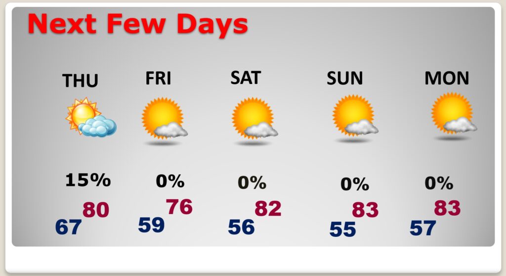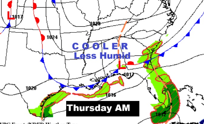 NEXT FEW DAYS: Spotty showers, maybe a thunderstorm are possible Wednesday. A cold front is on the way. Thursday’s high will struggle to reach 80. Late week – nights will fall to the 50’s. Some nice Fall air is on the way.