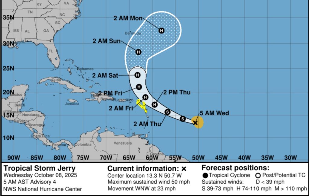 Tropical storm Jerry is getting stronger and could become a hurricane by tomorrow. It will curve into the open Atlantic. “Fish storm”.