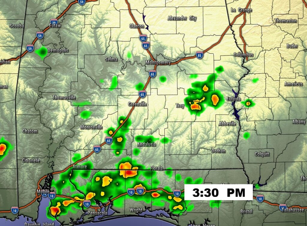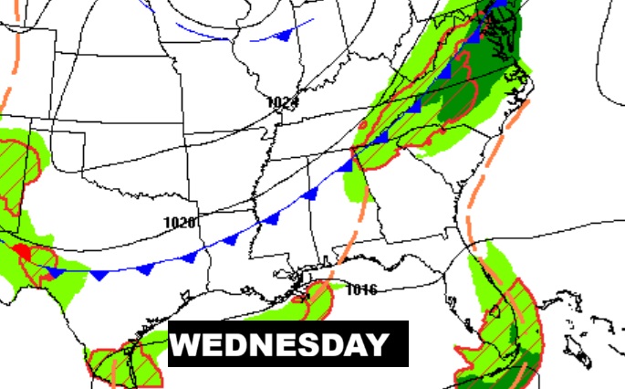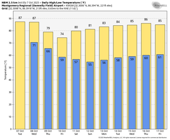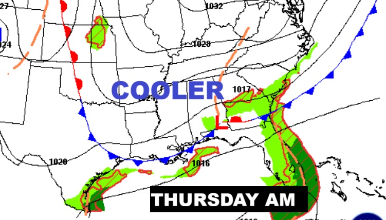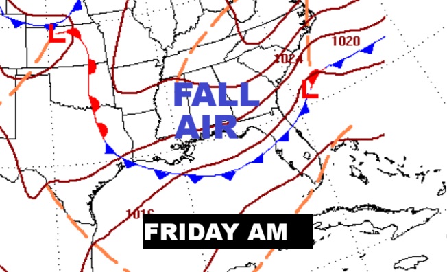 NEXT FEW DAYS: Spotty showers, maybe a thunderstorm are possible Wednesday. A cold front is on the way. Thursday’s high will struggle to reach 80. Late week – nights will fall to the 50’s. Some nice Fall air is on the way.
