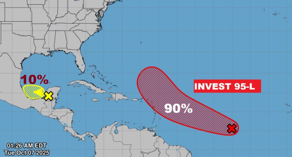 NHC is monitoring Invest 95-L. It now with a high 90% chance of development into a Depression soon. The next available name is Jerry. There’s also a new Area to Watch in the SW Gulf.