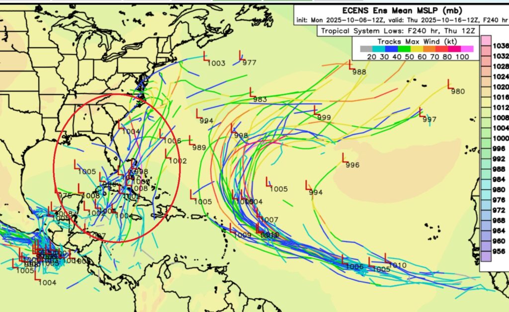 Besides Invest 95-L, the EURO Ensemble models Member Lows are highlighting some potential future trouble from the west Caribbean to Florida and into the Gulf.