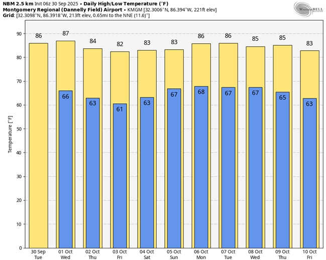 Good morning on this last day of September! Still no big changes in our future weather over the next several days. Basically the storm-free, dry forecast will continue well into the future. Future Radar tries to paint a couple of isolated showers in east central Alabama this afternoon. But, the rain chance is under 20%. It continues to be a very warm forecast for now. Expect upper 80’s again today. (Normal hi/lo 86/62) By late week, temperatures will come down just a little bit. Thursday through Saturday expect highs in the low to mid 80’s and near 60 by Friday morning. Isolated showers could return on Sunday. In the tropics, good news for the SE US, except for high surf and rip currents. Imelda and Humberto are headed out to sea. Imelda will likely become a Hurricane today. Here’s my brief video forecast discussion.