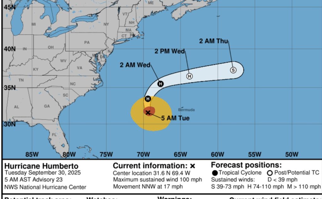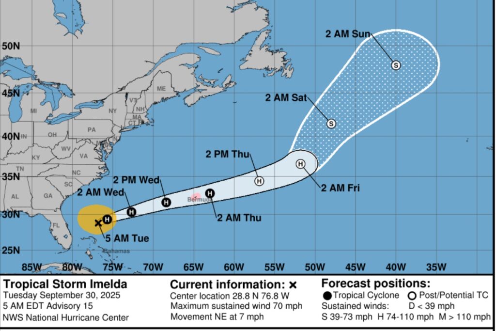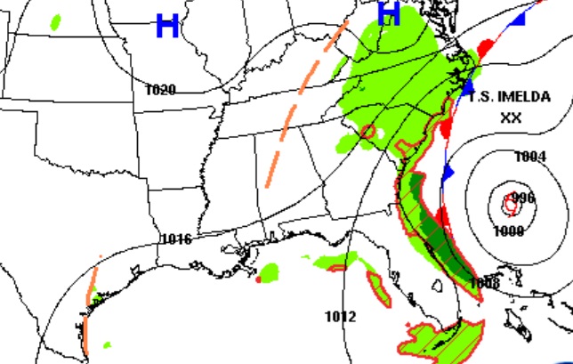 We can thank Hurricane Humberto for influencing the track of Imelda away from a direct SE US impact. Humberto’s winds are now category 2 at 100 mph, as it moves toward the open Atlantic.