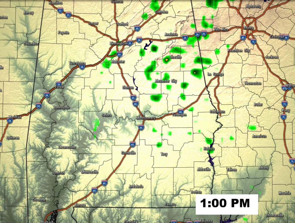 FUTURE RADAR tries to paint a couple of isolated showers in east central Alabama this afternoon. Rain chance mostly under 20%